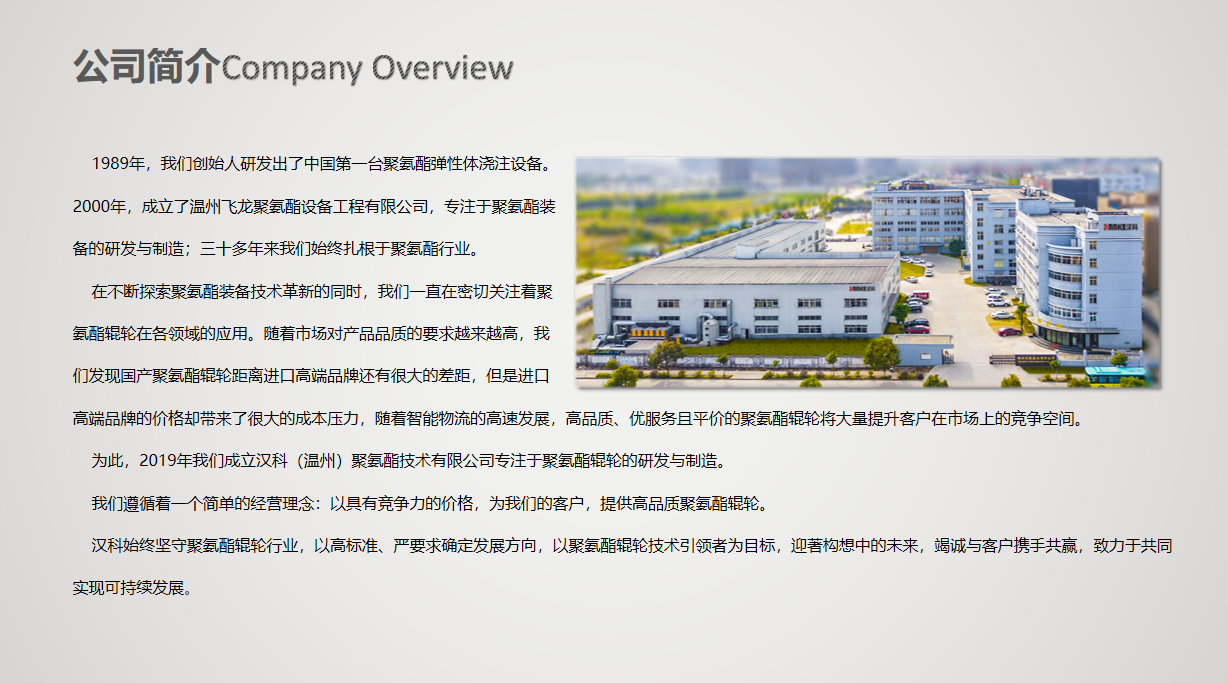 为此,2010年我们成立汉科(温州)聚氨酯技术有限公司(原浙江天赋实业有限公司)专注于聚氨酯辊轮的研发与制造。