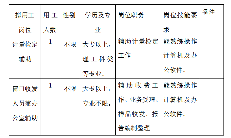 一、招聘岗位:窗口收发(兼办公室辅助)、计量检定辅助工作人员。