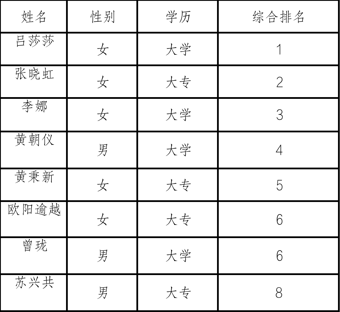 根据《矾山镇人民政府面向社会公开招聘工作人员公告》要求,经报名、资格审查、面试、考察和体检等程序,确定吕莎莎、张晓虹、李娜、黄朝仪、黄秉新、欧阳逾越、曾珑、苏兴共等8人为矾山镇人民政府编外用工,现予以公示。