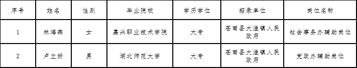 根据苍南县大渔镇人民政府公开招聘编外人员工作要求,拟聘用下列人员为相关用人单位工作人员,现予以公示。