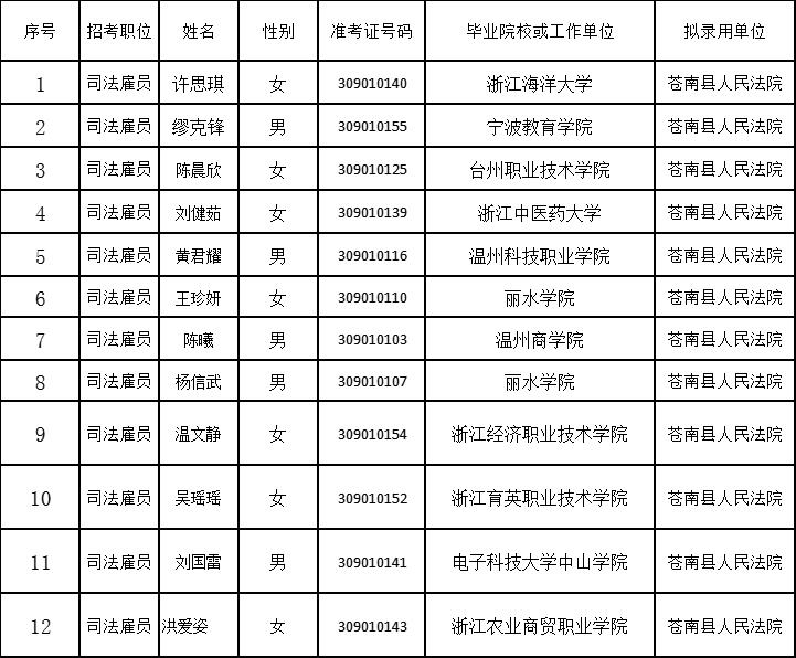 苍南县人民法院考试录用司法雇员公示表