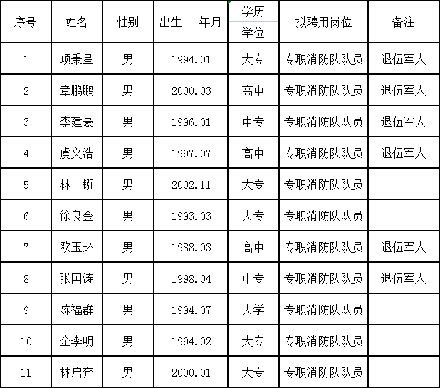 根据《钱库镇人民政府面向社会公开招聘消防队队员公告》(2022年8月31日发布)规定的程序,经公开报名、资格审查、面试、体能测试等程序,确定下列拟聘用人员,现公示如下: