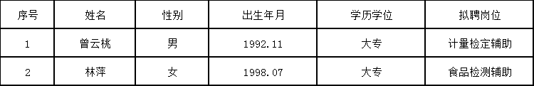根据《苍南县质量技术监督检测院 苍南县劳动保障事务所 招聘劳务派遣制员工公告》(2023年04月06日发布)要求,经报名、资格审查、面试和体检,确定下列拟聘用人员,现予以公示。