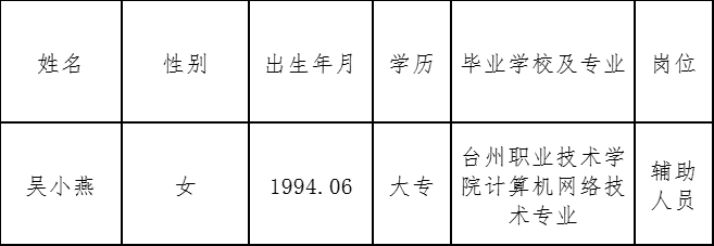 根据《苍南县林业事业发展中心面向社会公开招聘编外用工人员公告》要求,经报名、资格审查、面试和健康体检,确定吴小燕为编外用工拟聘用人员,现予以公示。